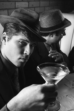 Two Caucasian prime adult males in retro suits sitting at table with cocktails.