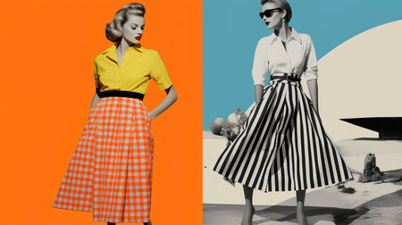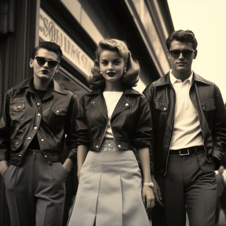 People fashion clothing 1950, 1960 in the style of iconic rock and roll imagery, Times of driving music, trendy hairstyles, stylish clothes, daring deeds, leather jackets and colorful dresses