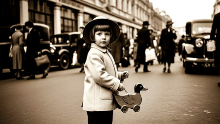 Charming sepia-toned image of a child with a pull-toy duck on a bustling urban street. Perfect for evoking nostalgia, childhood, or historical themes.