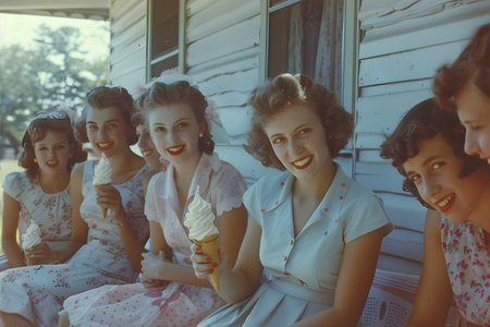 Group of beautiful girls with ice cream in their hands. Retro style.