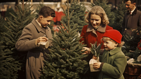 A happy family chooses a New Year's tree at a Christmas tree market in the Soviet past. Merry Christmas and Merry New Year concept