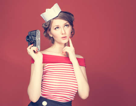 Girl with vintage photo camera. Pin up pretty fashion model photographer. Woman with retro hair, makeup and old camera. beauty, retro look, pinup fashion. media and new technology, journalism.