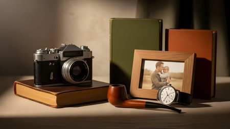 Collection of classic objects including retro camera wooden tobacco pipe framed photo and wristwatch resting on books
