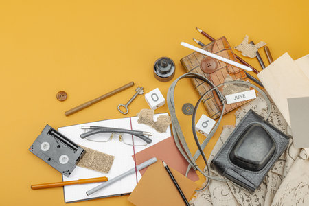 Flat lay composition with vintage journalism tools, symbolizing press freedom, OSINT and Journalist's Day in Ukraine. Retro elements, analog camera on ochre background, top view