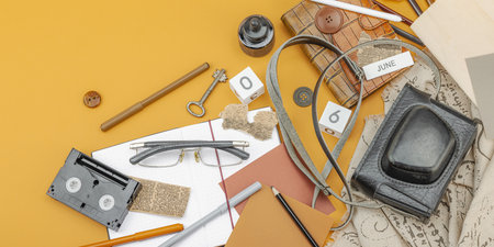 Flat lay composition with vintage journalism tools, symbolizing press freedom, OSINT and Journalist's Day in Ukraine. Retro elements, analog camera on ochre background, banner format
