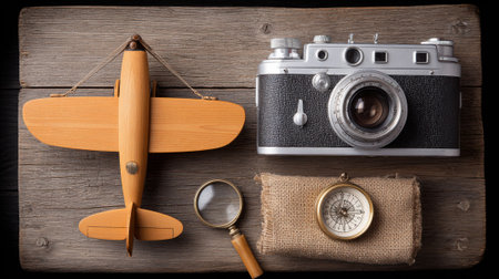 Overhead view of vintage travel items including a wooden airplane, camera, magnifying glass, and compass on a rustic wooden background.