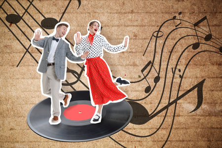 Retro party poster. Couple dancing on vinyl record against dark beige textured background with music notes, creative collage