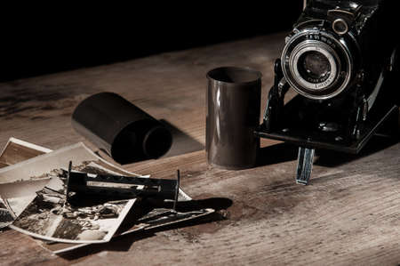 Explore a captivating still life featuring a vintage camera amidst a treasure trove of old photographs and film negatives, embodying nostalgia and timeless stories of the past.