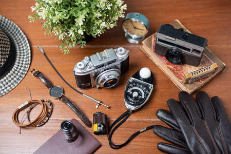 Retro mockup, vintage photographic accessories and quipments around on wooden Background.