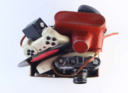 Cardboard box with retro film camera, gamepad, vinyl record, phone tube on a white background. Antiques, trash
