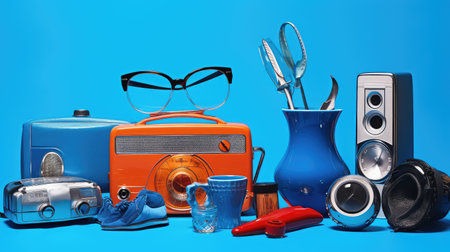 A collection of vintage gadgets and electronics displayed on a teal background. Items include retro cameras, clocks, and radios, evoking a sense of nostalgia and vintage charm.