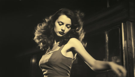 Elegant vintage woman in club or disco. Happy and active dancers woman in retro style clothes dancing disco dance over green background. 1970s, 1980s fashion, music, hippie lifestyle luxury lifestyle