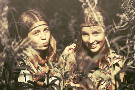 Two happy teen girls walking in summer forest