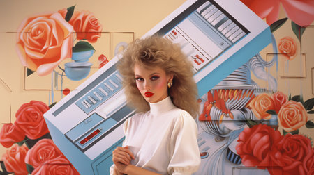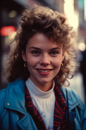 Retro inspired woman with 80s fashion and soft curls portrait image, ai generated. Curvy lady with geometric vintage jacket picture photorealistic photography. Nostalgic vibe concept photo realistic