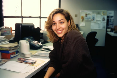 professional woman working at her desk in an office setting with various office supplies. Generative AI
