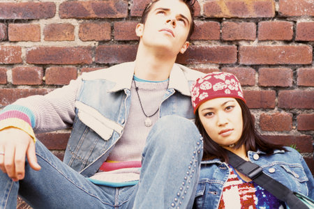 A 90s fashion photo shoot, with models in iconic 90s outfits, including denim, flannels, and bright prints, against a backdrop of 90s urban graffiti and street art, highlighting the era's fashion trends