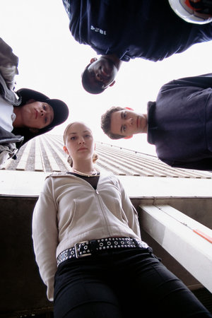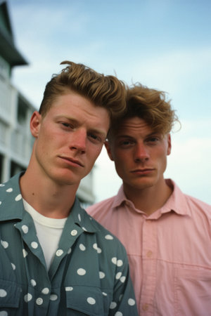 Group of young men standing in an urban setting, casually dressed and embodying relaxed summer vibes, with eyes toward the camera