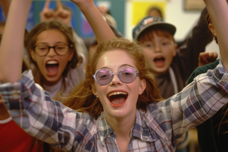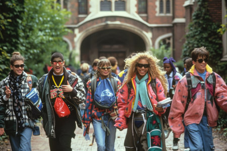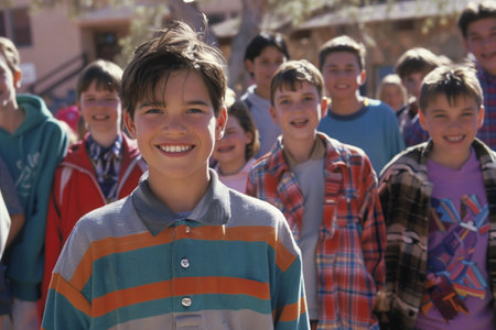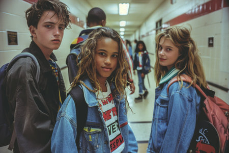 Nostalgic school days: a vibrant glimpse into the 1990s with schoolchildren and teenagers, capturing the essence of youth culture, education, friendships, and iconic fashion.