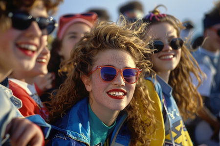 A group of stylish individuals dressed in retro-inspired outfits relaxing outdoors and showing camaraderie. The vibrant colors and accessories contribute to a sense of friendship and nostalgic lifestyle.