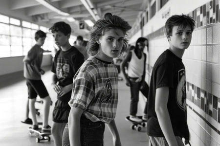 Cool funny pretty happy old school teenager children, vintage retro 1990s, skateboard basketball court, education nostalgia class student 80s