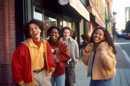 Portrait of group of black young people in retro 90s clothes and haircuts, photo of friends in nineties style, AI generated