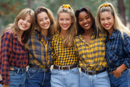 Five cheerful young women wearing plaid shirts and jeans are smiling together outdoors