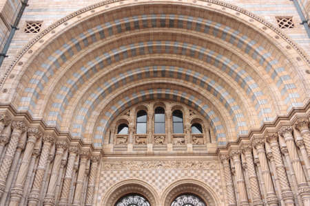 A detailed facade of a brick building showcases rhythmic horizontal bands, an arcaded entrance supported by elegant columns, and numerous small arched windows above.