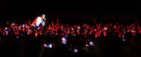 Krakow, Poland - September 20, 2014: Abstract background art of a cellphone camera capturing an artist performing rock music concert.