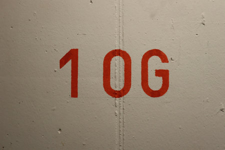 Red number 10G in parking deck, German for first or second floor on white textured wall - industrial sign detail