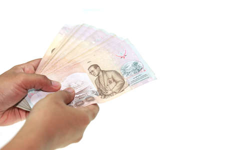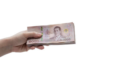 Hand holding Thai banknotes of 1000 baht or money currency in Thailand on white background