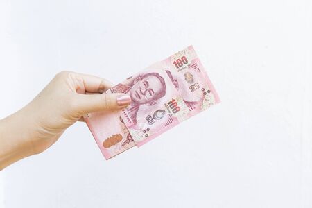 Girl hand holding bank note on white background, finance and banking concept, outdoor day light, investment and saving, Thai money, money exchange
