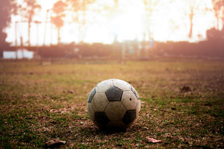 Old yellow soccer ball on the blue football field on the day of sunrise.