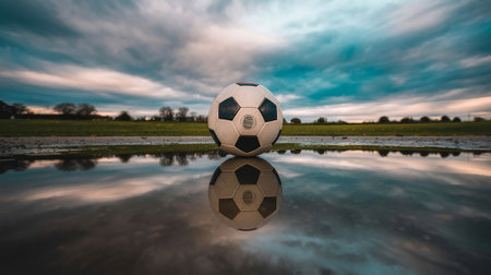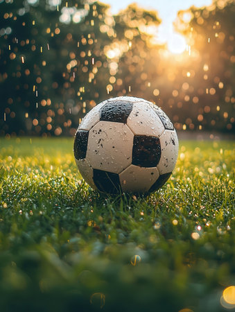 A worn soccer ball lies abandoned on a sandy beach as the warm hues of sunset cast long shadows. The setting evokes a sense of nostalgia and forgotten play.