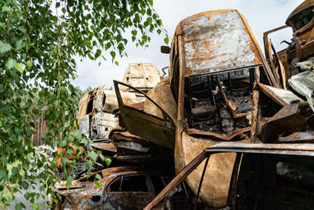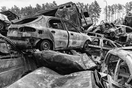 Irpin, Kyiv region, Ukraine - 28 April 2022: Car graveyard in Irpin, consequences of the invasion of the Russian army in Ukraine. Destroyed cars of civilian population.