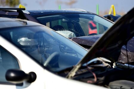 The car is broken. Car after an accident. Dump of broken vehicles. Road traffic accident. Warped metal.
