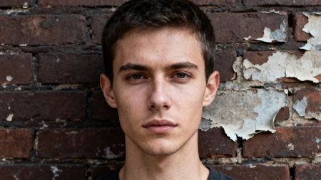 Dramatic headshot featuring a young Caucasian adult male with brown eyes and short dark hair, set against a background of distressed dark red bricks showing flaking white plaster.