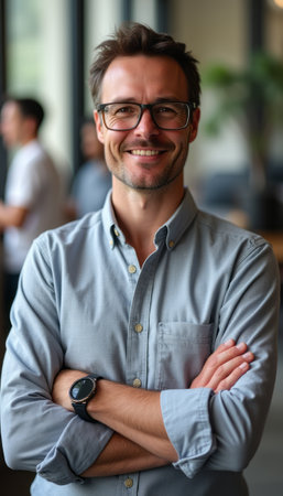 A cheerful man with glasses stands confidently with his arms crossed, exuding warmth and approachability in a modern office setting. His friendly smile and relaxed posture create an inviting atmosphere, perfect for showcasing professionalism and positivity.