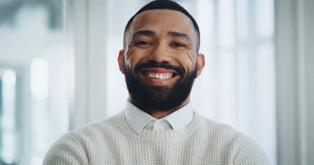 Portrait, journalist and happy business man in office, confidence. Professional, employee and creative reporter with smile for job opportunity, ambition and career pride for publication