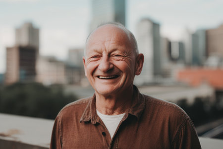 A close-up shot features a smiling man with a beard and short dark hair. The image displays warm tones with soft lighting. The composition highlights the man's expression, suggesting a positive mood. Suitable for various commercial uses, including advertising and editorial content.