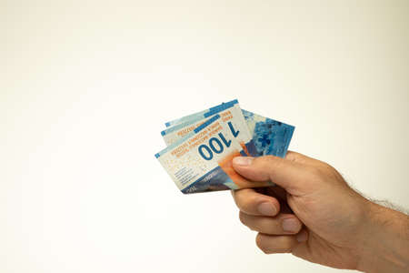 Hand holding showing euro money and giving or receiving money like tips, salary. 100 swiss franc banknotes CHF currency isolated. Concept of rich business people, saving or spending money.