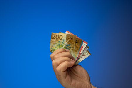 A spread of 20, 100 and 200 Swiss Francs banknotes, held in hand by a Caucasian male. Close up studio shot, isolated on blue background.
