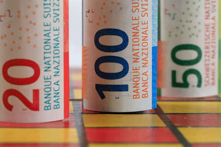 rolled swiss banknotes of ten francs on the table