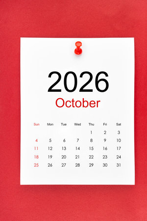 October 2026 blank desk calendar on red background.