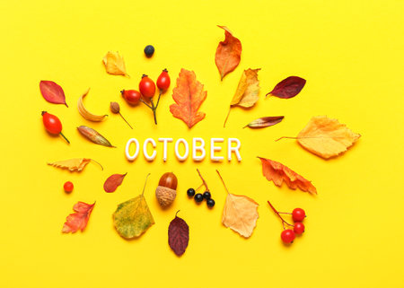 October letters with yellow and red leaves and fall fruits. Minimal flat lay creative concept. Autumn composition. Dried leaves on background. Month