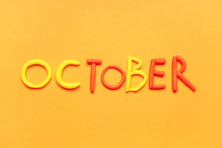 Word OCTOBER made of play dough on yellow background