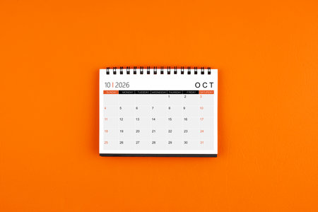 October 2026 Monthly desk calendar on orange leather background.