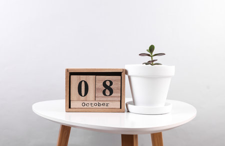 Wooden calendar organizer with date October 08 and decorative plant on table