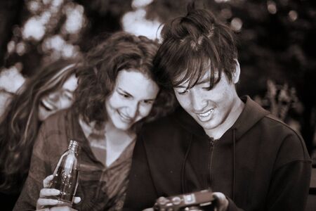 Young people looking at photos in a park