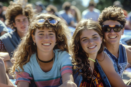 A group of stylish individuals dressed in retro-inspired outfits relaxing outdoors and showing camaraderie. The vibrant colors and accessories contribute to a sense of friendship and nostalgic lifestyle.