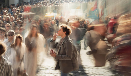 In a crowded location, one person stands out, shouting into their phone, while the surrounding crowd moves in a blur, capturing a moment of urgency.